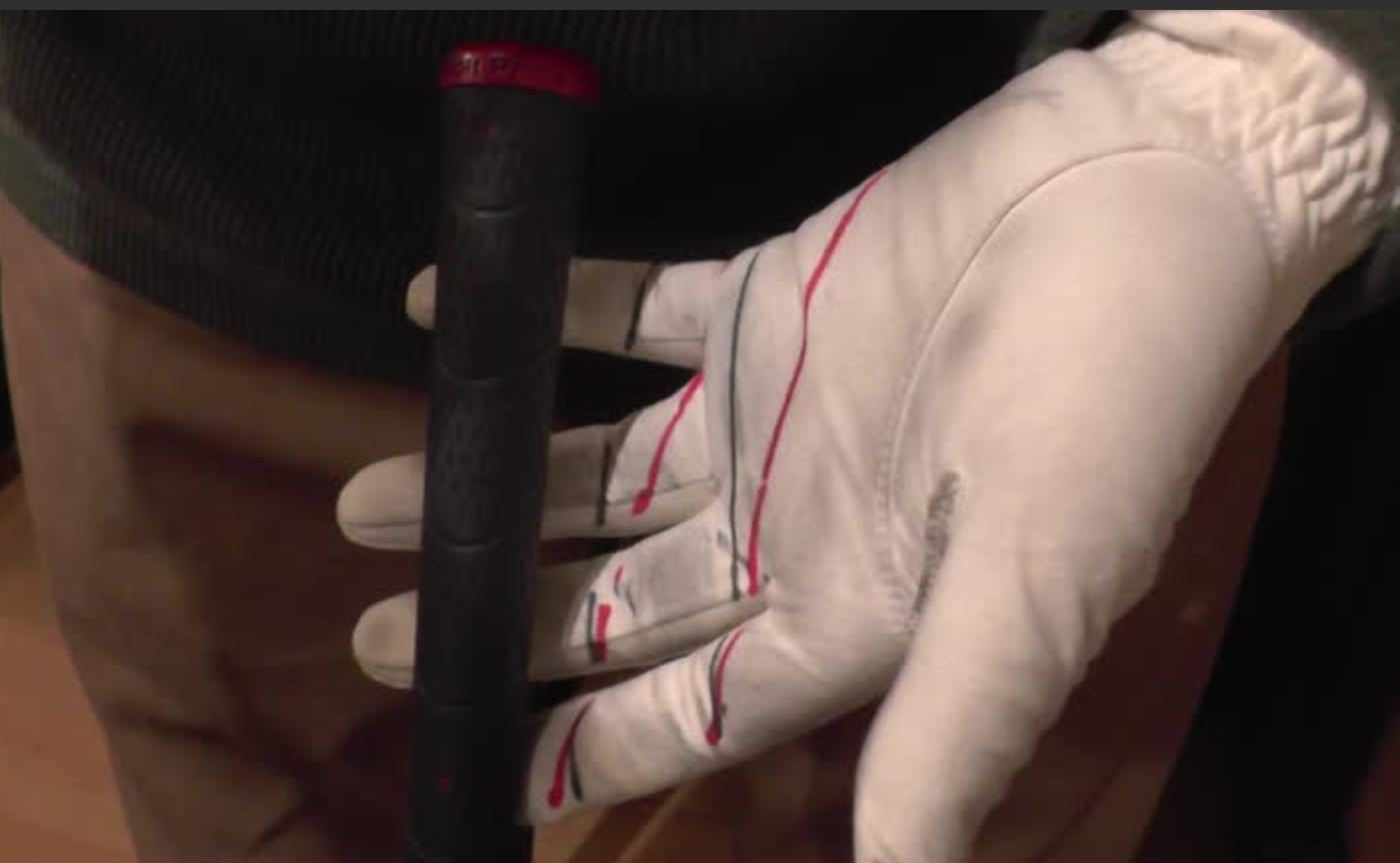 写真が示すようにグラブに2本線を描き、シャフトが手の正しい位置にくるようにします。